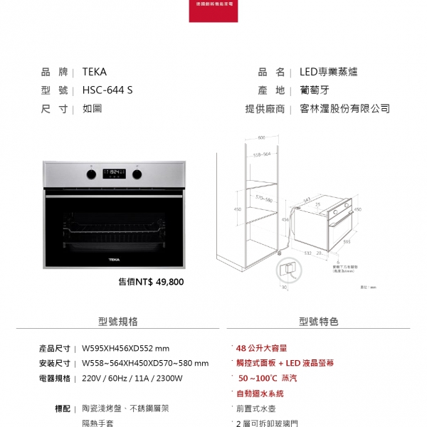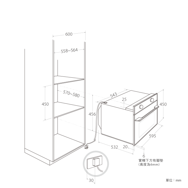 安裝尺寸:W558~564 X H450 X D570~580 mm(不含門板尺寸)