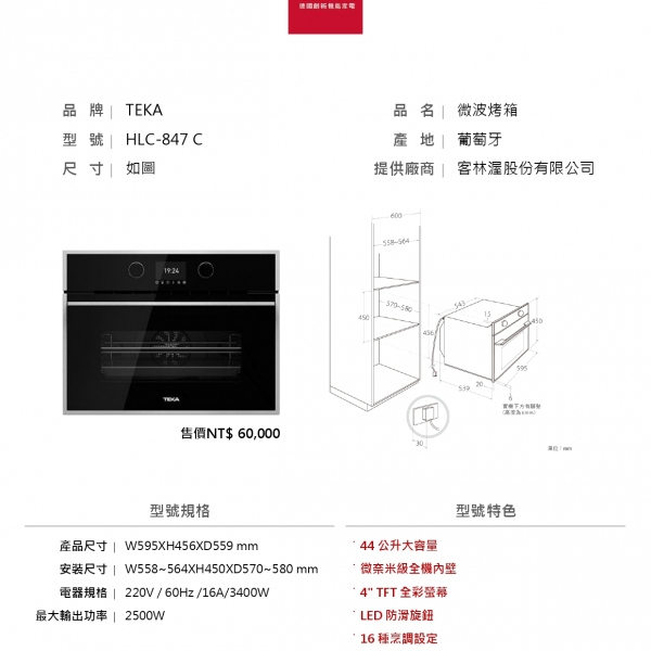 台灣櫥櫃深度較淺,建議家電接線空間設在機器後面左上方。
