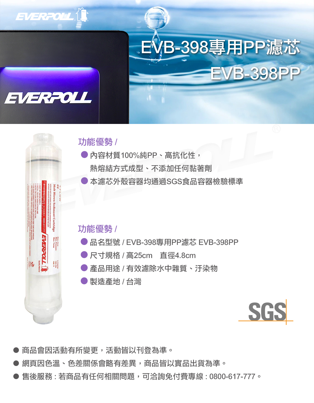 品名型號:EVB-398專用PP濾芯EVB-398PP