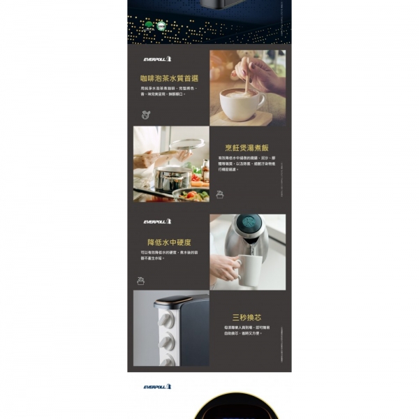 產品名稱:直出RO淨水器 產品型號:RO-900GPRO(尊爵黑) 專用配件:TDS數值檢測器(SR-900) 輸入電壓:100-240V~50/60Hz-3A 輸出電壓:DC24V-4A 消耗功率:90W 適用溫度:5~38C 淨水流量:2~2.5L/min(視進水壓力而定) 進水壓力:1~3kg/cm 工作壓力:4~8kg/cm 產品尺寸:長405x寬142x高415(mm) 重量:8.2kg 製造產地:中國
