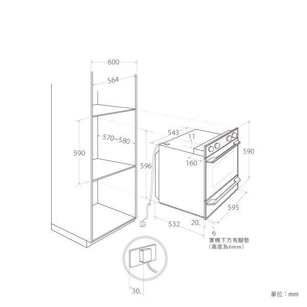 安裝尺寸:W564 X H590 X D570~580 mm(不含門板尺寸)